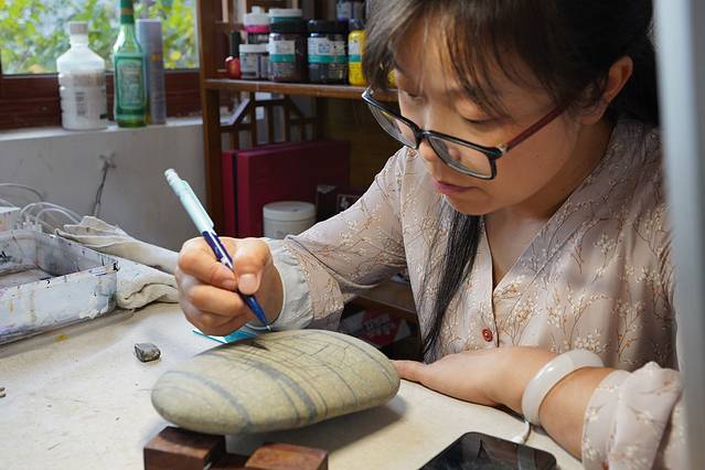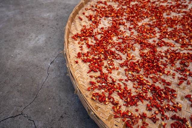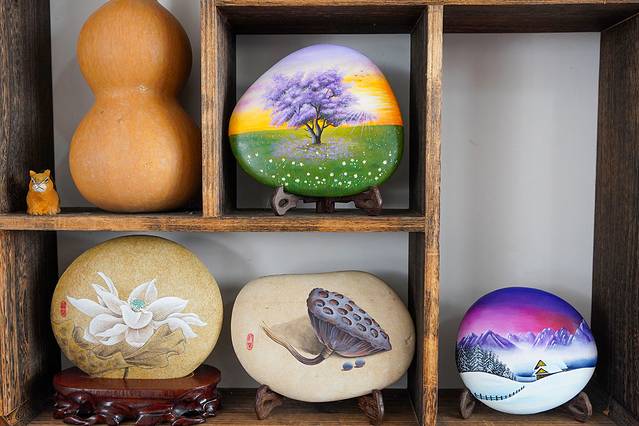 漫步在乡间小道,村里人的生活也是相当闲适。爷爷把把辣椒晒在门口,用火红的艳丽点缀着安静村庄。慈祥的大妈敲打着黄豆,节奏声里,是劳动人民的艰苦奋斗。美丽的小姐姐在石头上作画,放满柜台的石头画,是艺术工作者的勋功章。