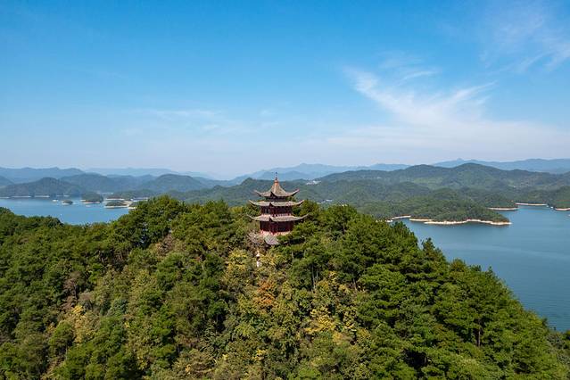 先说说龙山岛。“桐桥铁井小金山,石峡书院活龙山”,原本是龙山,千岛湖建成后便成了龙山岛。岛上建有海瑞祠,飞檐翘角,从海瑞祠拾级而上,约行五百级石阶小径可直达宁古钟楼。把无人机放飞,从高空俯瞰,全岛形似一条俯卧欲飞的苍龙,宁古钟楼更像是龙角所在。