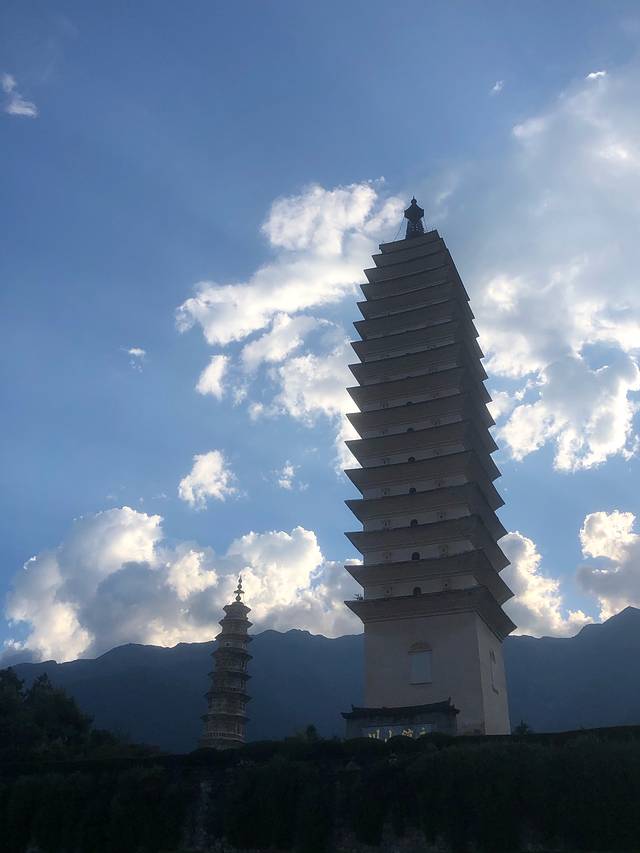 下午4点从古城出发,坐了商务车前往崇圣寺三塔,景区里有直通车也买了毕竟姨妈们爬不动了,整个景区除了三塔,后面还有寺庙殿宇是在山上,光靠腿走太累了,还是需要买直通车票的。三塔后面还有寺庙殿宇在山上,爬到最高处,可以看到洱海。