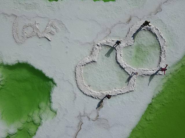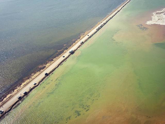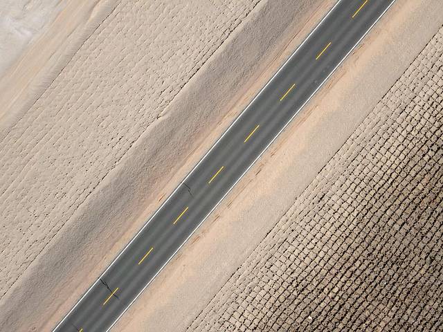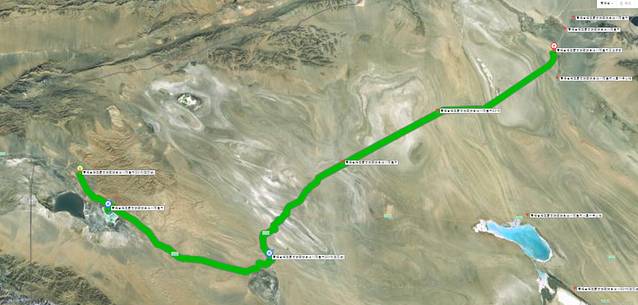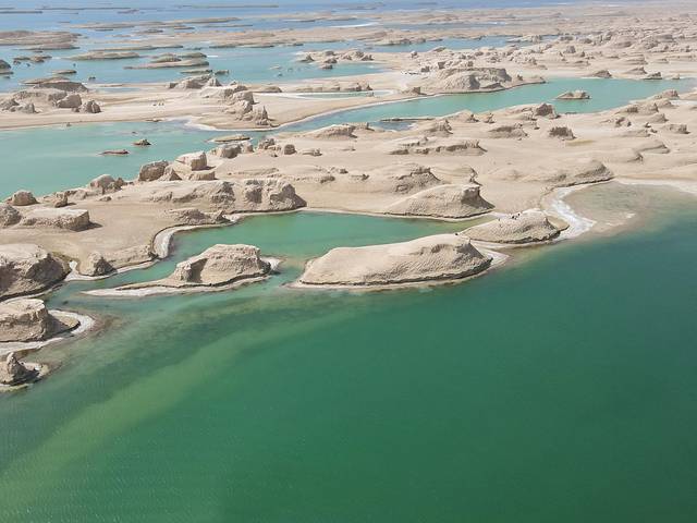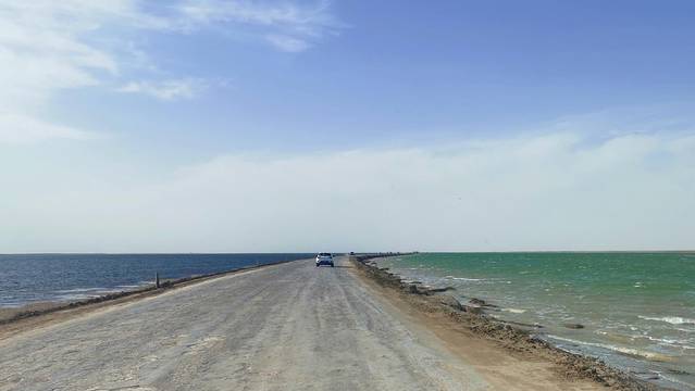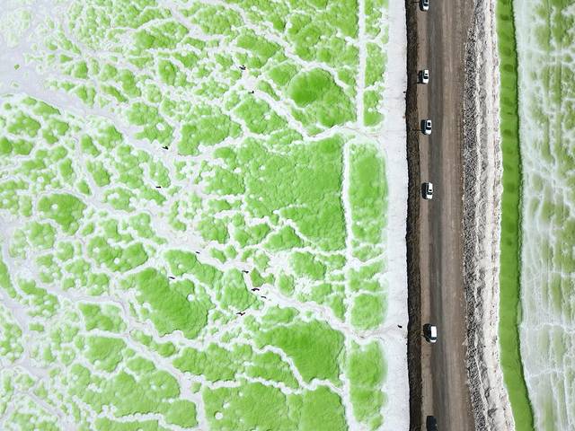 乌素特到茫崖的路上会经过西台吉乃尔湖,也是盐湖,道路穿过湖面,将湖面一分为二,这个景点也叫双色湖,左边是深蓝色的湖水,右边是绿宝石色,在盐湖边拍照还是不错的,有天空之境的感觉,但是要注意小心陷入泥土中。