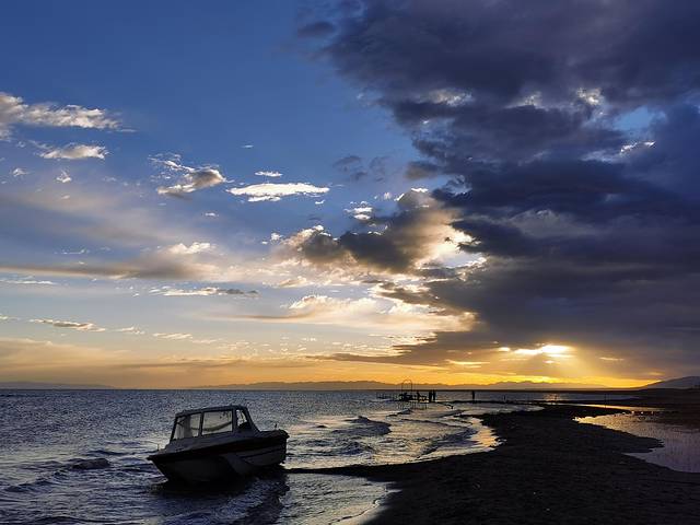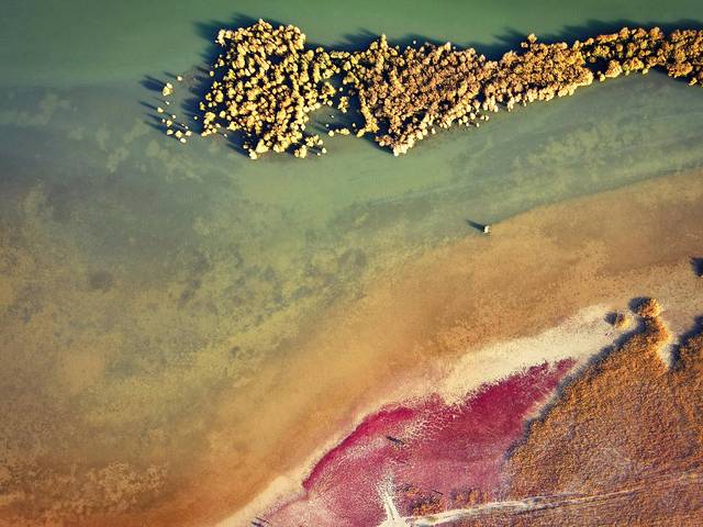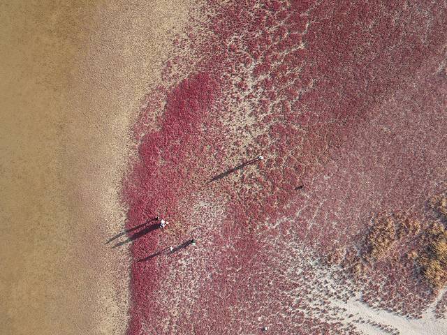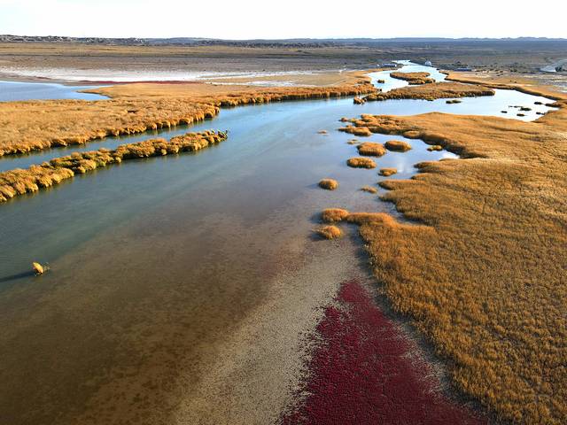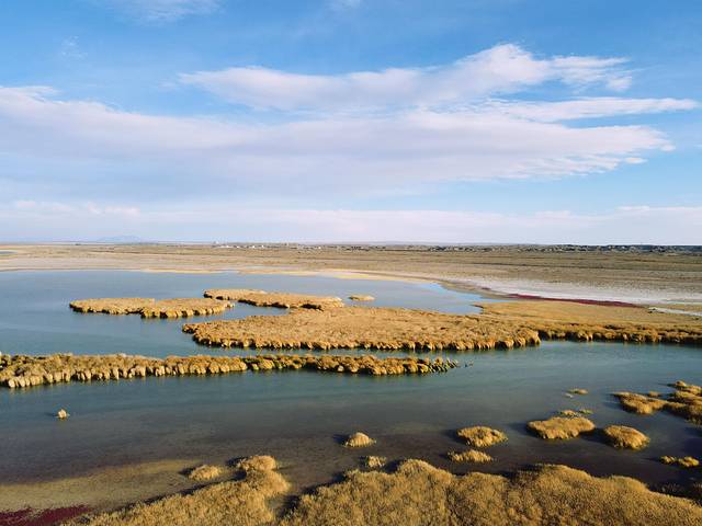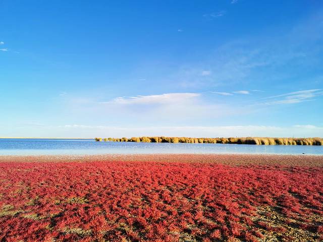 可鲁克湖算是我们的意外收获了,从托素湖经过一个像外太空飞碟的道路关卡,就看到了美丽的湖面,湖水退了很多,红色的海草露在地面,形成大面积的“红海”,黄色的芦苇,红色的草地,蓝色的湖面,远处的高山,候鸟成群的飞在湖面,显得格外的美丽。感觉今天30多公里的搓衣板路也是很值很值了。