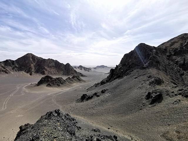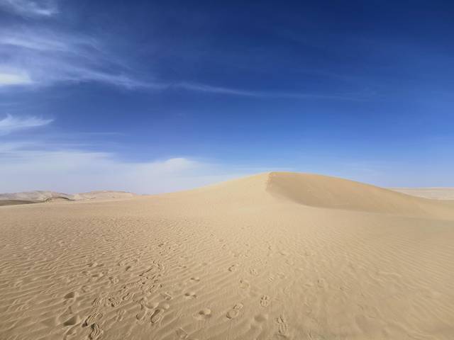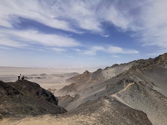 一个未开发的景点,原本可以开车进入,但是由于大量越野车对地表的破坏,前几个月封闭保护了,只能翻越铁丝网步行抵达。这个山体位于戈壁中,看上去路程很近,但是走起来还是需要45分钟左右可以抵达山脚,我们选择了其中一条前人攀爬的路线上山,上山比较陡,沙石山体,易下滑。我们没有爬到最顶峰,风很大,风景很美很壮观,就是很累,上去腿脚有点酸。
