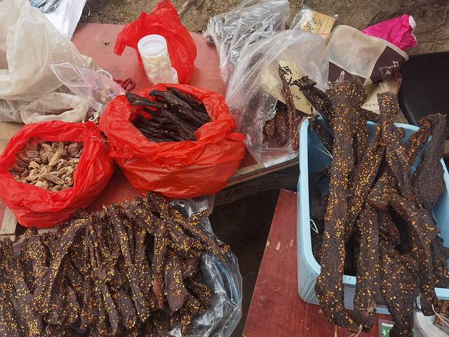 我们坐观光车上山坐了半个小时左右。山上最高海拔四千米左右。因为季节问题,没有下雪,没有看到壮观的雪景。但是有看到远处的贡嘎雪山,哈哈。车到达上面,还需要再爬一百多米才能到顶上。上面有很多卖牦牛肉的,还有什么松茸之类的。喜欢的朋友可以买来试试。牦牛肉大概在50到90一斤的都有。