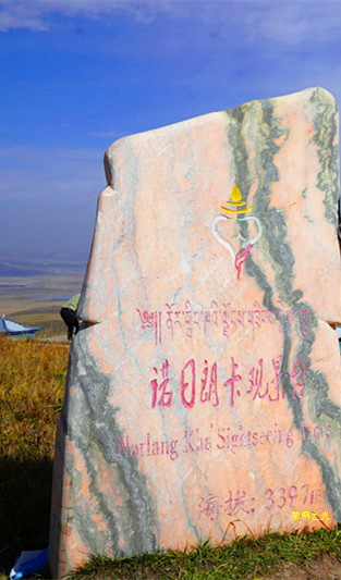 当我们停车拍照时,跟随在后面的好多车辆都停下来,游人们经不住美景的诱惑,都拿出手机拍风景。看来大家对美的追求都是一样的。我们的车很快驶过麻当镇,在王格尔塘分路后,经过夏河县城,10:50我们到达了诺日郎卡观景台。这里有停车场、卫生间,还有当地小伙们搭起的简易帐篷,售卖当地的土特产。有栈道、观景台等设施。我们一行六人看见草原兴奋无比,沿木栈道走上最高处,顿时,视野一下子开阔了!哇塞!太美了!这金黄色的甘加草原和绵延不绝的山峰,深深地吸引了我们的眼球,感觉我们尘封的心灵一下子被打开了!极目远眺,只见四周山峦起伏,由近及远一层层扩展开来,整个草原美景尽收眼底,草原好似一块天然的彩色地毯,蜿蜒的公路、村镇、海子、如绣花一样点缀在地毯上,绵绵延延直到天际,最后隐藏在浓浓的云雾中若隐若现,充满了无限神秘感。景色广阔大气,层次分明,极其壮观。我们异常兴奋,拿出手机、相机齐上阵,三个人一张,五个人一“咔嚓”,这儿欣赏,那儿观看,尤其是几位女同胞,更是久久不愿离开,在多次呼喊后,才依依不舍的停止了拍照。