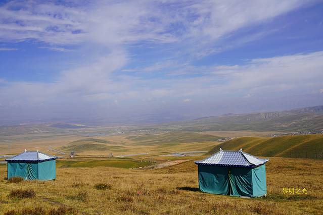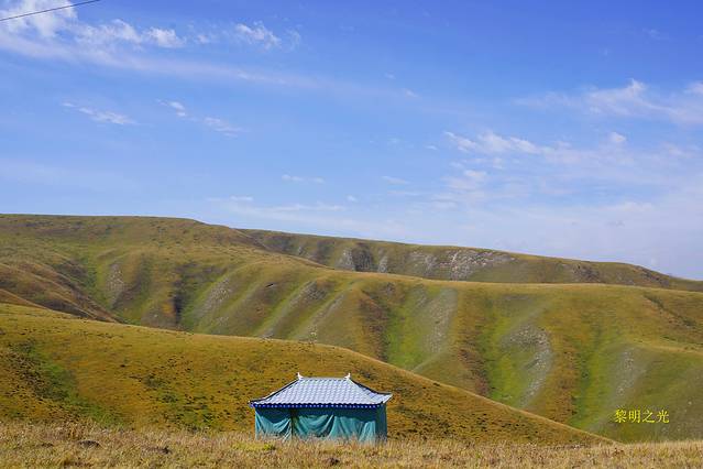16:30离开,沿公路继续向前行驶,开车爬上一段陡坡,来到一处高地,一排浅米色的现代化帐篷赫然映入眼帘,有许多车辆和游人,这里应该是地图上标注的草原星空站吧,我们没有停留,直接沿公路下山,这条路有点窄,有会车避让点,但风景美轮美奂。近处是起伏的草原,金黄色的牧草随风飘逸,牛羊悠闲的摇摆着尾巴,漫步在草地中。远处是连绵的高山和山顶上漂浮的白云。幽静的牧场没有嘈杂的声音,除了汽车的轰鸣声,就好像来到了世外桃源,感觉所有的奢望在这里都消散了,只留下眼前的美景让人流连忘返。女同胞们喊叫着停车,但我没有停,想把这美景印在脑海中,收藏的内心里。