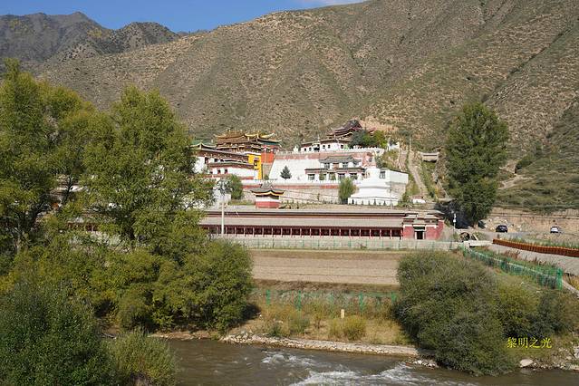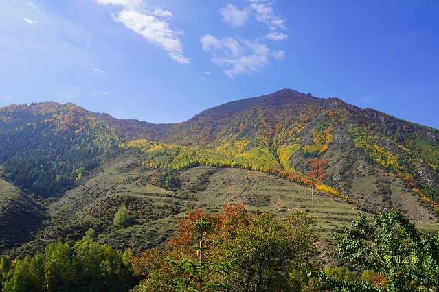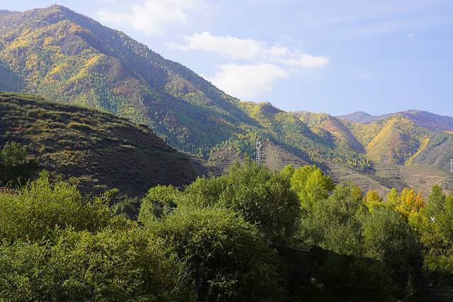 我们的目的是自由逛、散散心、欣赏风景,无需赶时间,所以没有上高速,而是沿兰磨线前行。经过土门关,汽车开始在山谷中蜿蜒行进,这里群山叠嶂,一会儿翠绿的青山夹杂着红色、黄色的树叶,似一幅幅大型油画,一会儿土灰的山峰点缀着褐色的印记,恰似一幅缓缓展开的水墨画;一会儿视野突然开阔,青山绿水,一会儿群山遮挡,好似无路可行;一会儿出现在眼前的是建筑新颖的藏寨,一会儿又见半山腰中时隐时现的佛教寺院;眼前绝妙的风景,湛蓝的天空映衬着朵朵白云,加上我们放飞的心情,感觉无比兴奋,一路走走停停,说说笑笑,拍照留影。