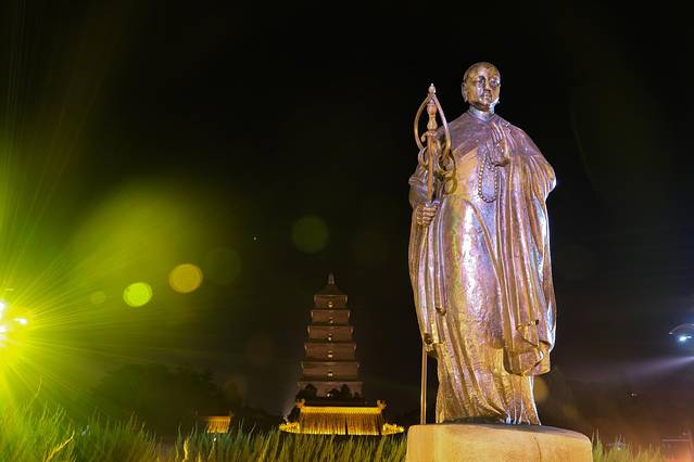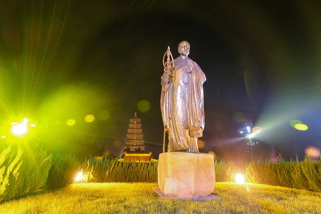 玄奘本姓陈,13岁出家,21岁受戒,精研各家,因为感到佛宗流派说法不一,混乱不堪。于是决心去西行求法,往返历时17年,行程五万里。带回了大小乘佛经多达520夹,657部。玄奘回到长安后,居于大慈恩寺,潜心翻译这些从西域带回来佛经。历时19年,共译出佛经75部,共计1335卷。同时,并将一路见闻写成《大唐西域记》12卷。因为翻译的佛经太多,所以修筑佛塔存放经文,这就是大雁塔。