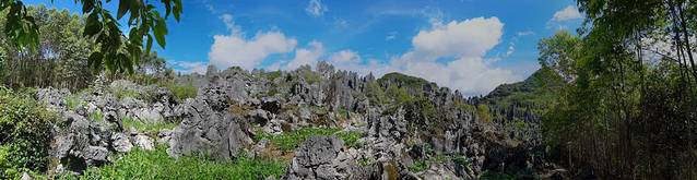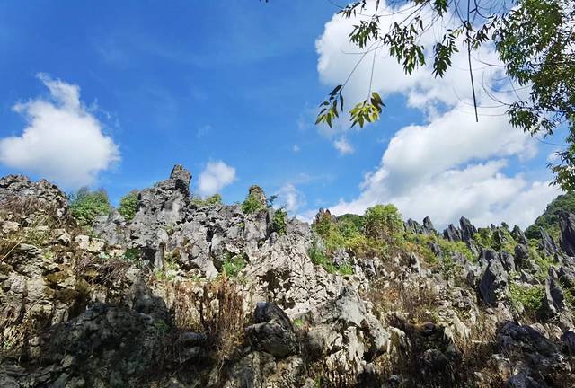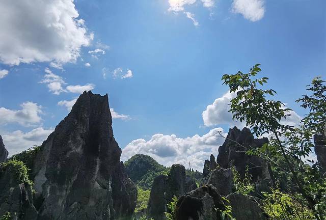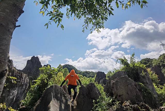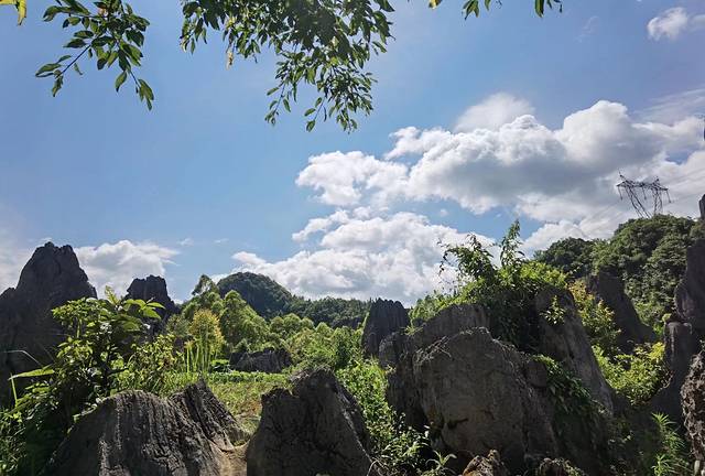 走过曲曲弯弯的小路、郁郁葱葱的竹林,忽然眼前一亮,豁然开朗,只见:一个深陷的山谷被耸立的山峰包围着,从谷底到谷顶,不规则的石头以各种形态不规则地遍布整个山谷;从谷底到谷顶,有不同小路曲折向上,沿着这些小路,可以近距离地去观赏这些石头,山谷中掩映的房舍、摇曳的蕉叶、一小块一小块的田畴,和这些神奇的石林,构成了一幅奇妙的山野风光图。