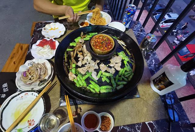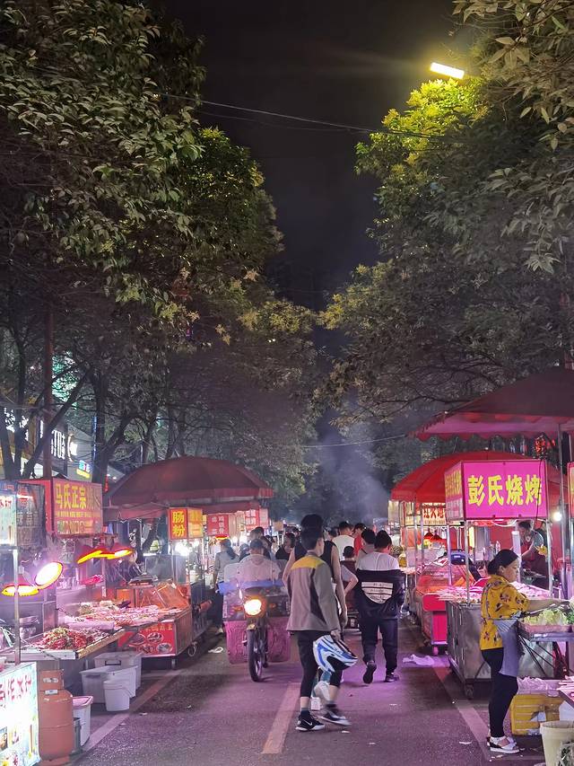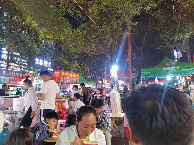 丹霞北路步行街,是盘州市最红火的烧烤一条街,还没走到这条街,远远飘过来的香味,就足够把人撩的垂涎三尺。步行街两旁的人行道上,小桌子、小凳子都摆满了,到处都是人,一看到这种架势,会让人立刻骚动起来。