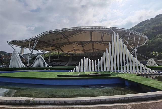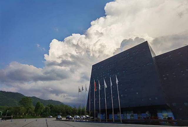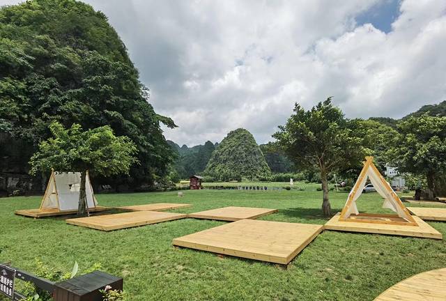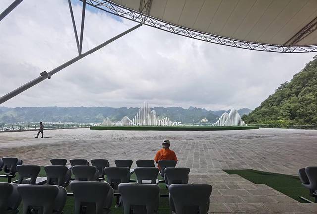 二是开幕式场馆。开幕式场馆有点像一块滑板,又有点像降落伞,它正前方正对着万峰林,舞台就搭在高坡上,在这里可以看到远远的万峰林全景,国际山地旅游暨户外运动大会开幕式就是在这里举行的。