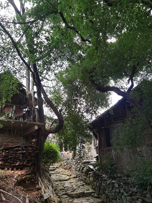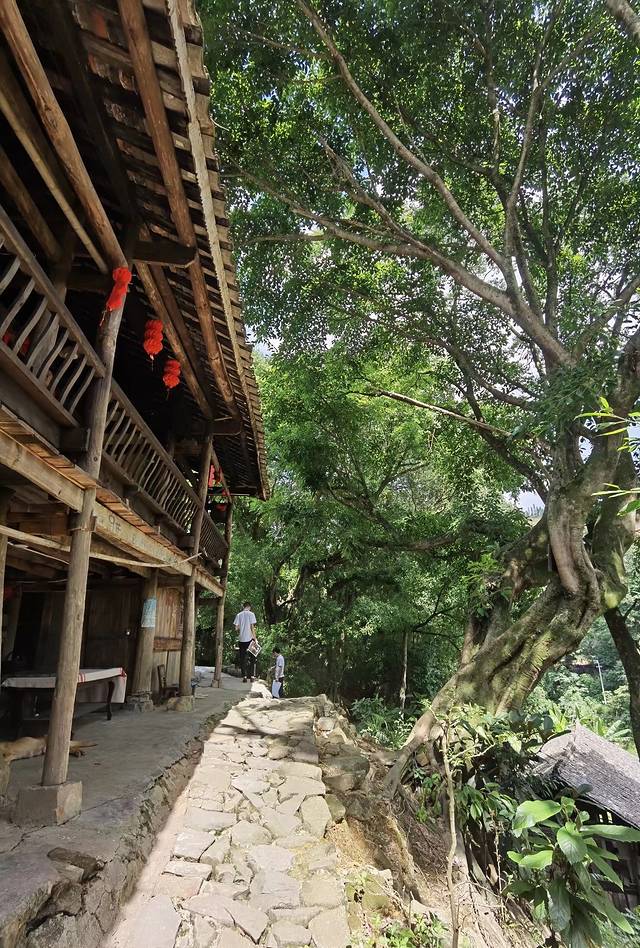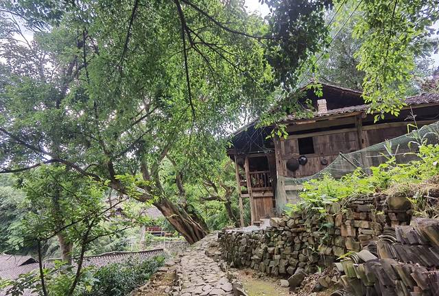 二看现在。由于古寨远离城市,藏在大山深处,当地交通不是很方便,使得古寨的原生态保护得相当好,走进寨里,只见浓荫覆盖、古朴幽静,远远望去,古寨被千姿百态的参天大榕树严严实实地包围着,布依吊脚楼在树林中若隐若现,一切都显得非常的自然:寨里除了寨口广场上,有小饭店、小客栈和卖特产的店铺外,没有商业化,显得格外的清静,一打听,原来为了更好地保护好寨中的古建筑群,古寨已被评定为省级文物保护单位,所以这里的原住民,大都已搬迁到定居点,只有少许乡民还留在寨里。