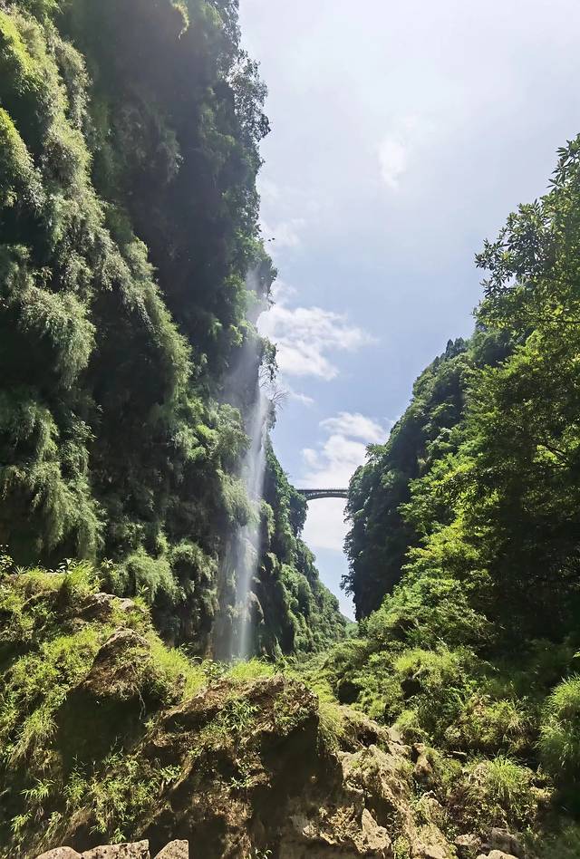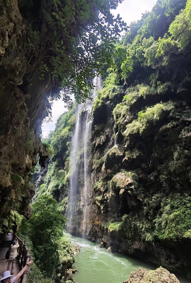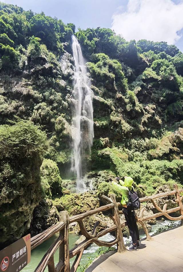 游玩大峡谷景观一般不累,下到谷底,然后沿着栈道转一圈就是,马岭河大峡谷也是这般情况,就是下到谷底有段山路要爬的,不想爬的,可以坐观光电梯上下。谷底太阳很晒、也很闷热,估计风是被周围的山峰挡住了吧,还好有瀑布飘过来的水雾和哗哗流淌的河水,给人一种清凉的感觉。