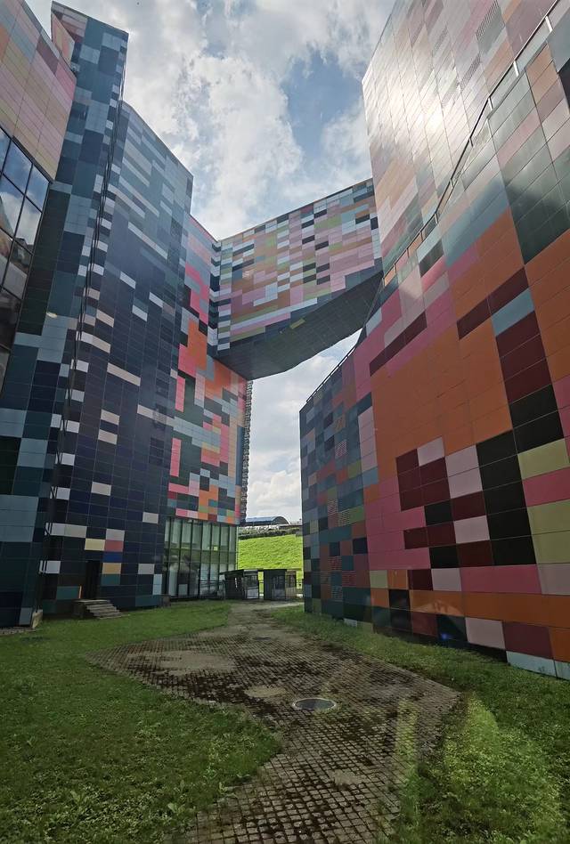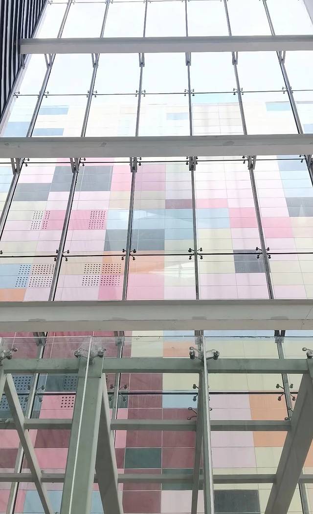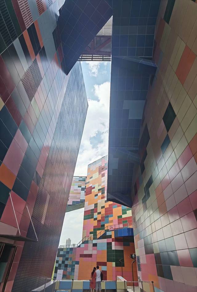 博物馆为三叉弧形堵式建筑,与周边的贵阳国际会展中心、贵阳城乡规划展览馆、贵州省图书馆的现代风格协调一致、遥相呼应,博物馆内庭,多彩的外立面五彩缤纷、吸人眼球,仿佛走进了一个魔方世界,博物馆的内部装设,民族和时尚的融合在一起,感觉很搭,这样的背景效果,拍片出来很有范。