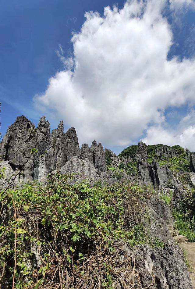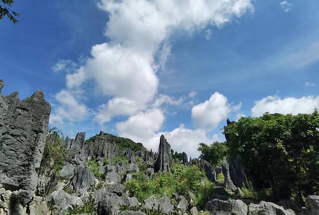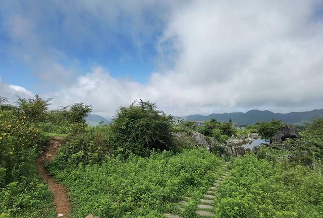 我们是按照导航一路过去的,导到了一个空地不导了,说是已到目的地,看着周围,没有山门、没有售票处、也没有有关景点的任何标志,只有几家民宅,还有一条蜿蜒的小路通向山上,怎么看也不像是个景区,难道就是这条小路通往石林?问了当地老乡,说是沿着这条小路,往上走、再往下走就到了。