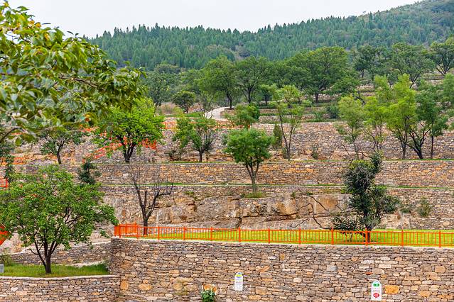 被人打造修缮后的村子,入村子便是宽阔而又平缓的路,弯弯绕绕依山势而成,一侧是如“梯田”般的石头垒砌的景观;另一侧是人工堆砌而成许多半圆形石堰墙。错落有致、有林果、有草坪,乍一看还是有些独特的,远处是山林密布、近旁有山泉溪水流淌,缓缓地行驶过这无人的村路,竟也被温柔地风吹皱了心湖。