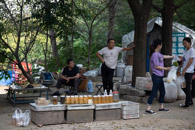 把车子停在寺外的停车场,有卖当地特产的摊子和养蜂人与游人在聊天。踩着长长的阶梯向寺内走去,脚下有几片落叶,忽觉得,到了深秋,这落叶覆满阶梯,也是别有一番味道的。