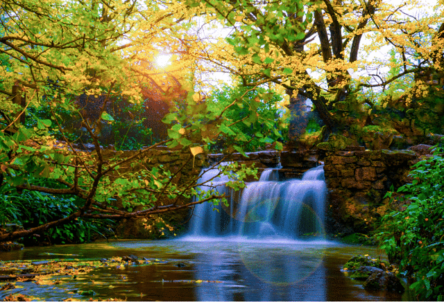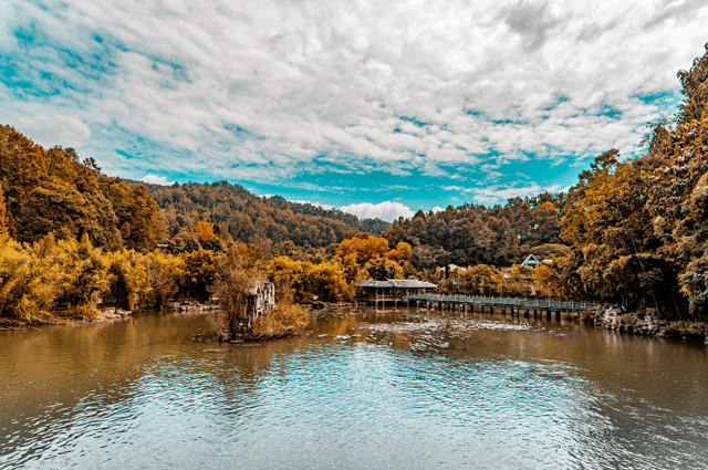 龙宫的龙潭湖水面宽阔,水色澄碧,既有翡翠的墨绿,又比其更加透亮。秋天一潭碧水与岸边的植被相映相辉,组成了一幅绝美画卷。