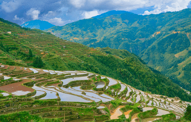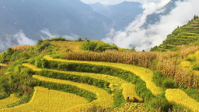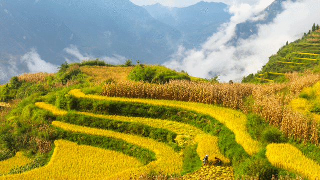 贵州顺势而为创造出梯田这一独特的耕种方式。秋日金灿灿的夕阳之下,梯田或云光霞影,灵气逼人,或色彩斑斓,宛若人类绘制在大地上的精美画作。