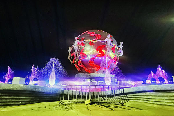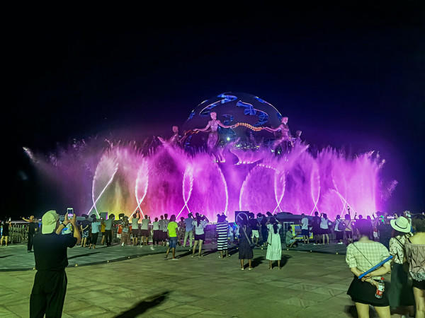 屹立于银滩上崭新的“潮”雕塑,是北海的城市象征、地标构建物和城市文化符号,寄托了无数人对北海的向往,是万千游客到北海非去不可、刷爆朋友圈的拍照留影地。而最吸引人的是集合了“特殊影像、喷泉秀、喷火秀、灯光秀、激光秀、烟花秀、音乐”七大功能于一体的潮雕喷泉灯光秀,30盏由缺到圆的月亮潮汐灯环绕在“潮”雕塑周边,与“潮”雕的“明珠”一起,星辉闪耀,珠联璧合,整个广场如同装满珍珠的玉盘在海边铺陈开来,极具视觉冲击力强劲而震撼,出乎意料。