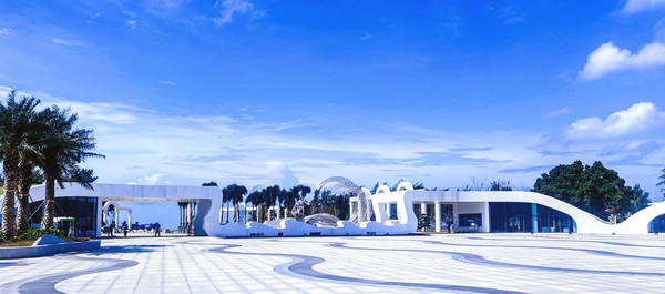 白天的“潮”雕钢面映衬着蓝天白云和湛蓝的大海,天然纯净。夜晚的“潮”雕灯光秀则集“特殊影像、喷泉秀、喷火秀、灯光秀、激光秀、烟花秀、音乐”于一体,熠熠生辉。30盏由缺到圆的月亮潮汐灯环绕在“潮”雕塑周边,银沙逐浪区大门、欢乐港湾区大门、秀映潮雕区大门灯光璀璨,与路灯、照树灯、景观灯把景区打扮得光彩夺目,星辉闪耀,整个广场如同装满珍珠的玉盘在海边铺陈开来,美不胜收。