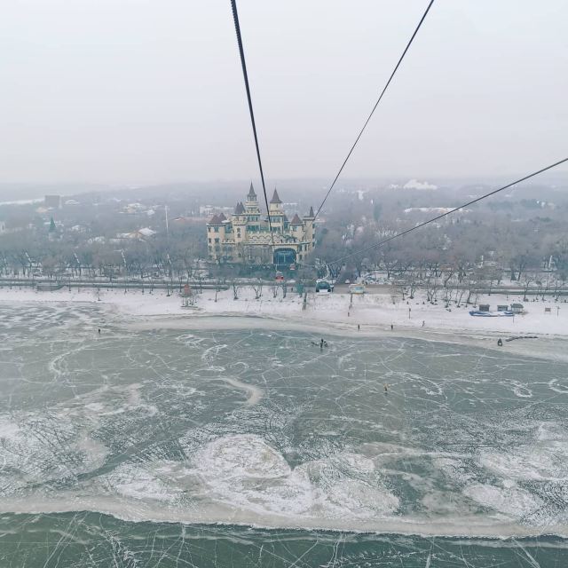 正戏开始!一大早起来,乘坐旅游专线直奔太阳岛风景区。先去看雪博会,等到了晚上再去冰雪大世界看冰雕,看跨年演唱会!首先乘坐索道,缆车是先上后下,行至最高处可以俯瞰整个松花江,期间还看到有人徒步横跨松花江(冬天已结了厚厚的冰),甚是震撼,能够徒步横跨松花江,也是难得的经历,可惜我没有那么多时间......