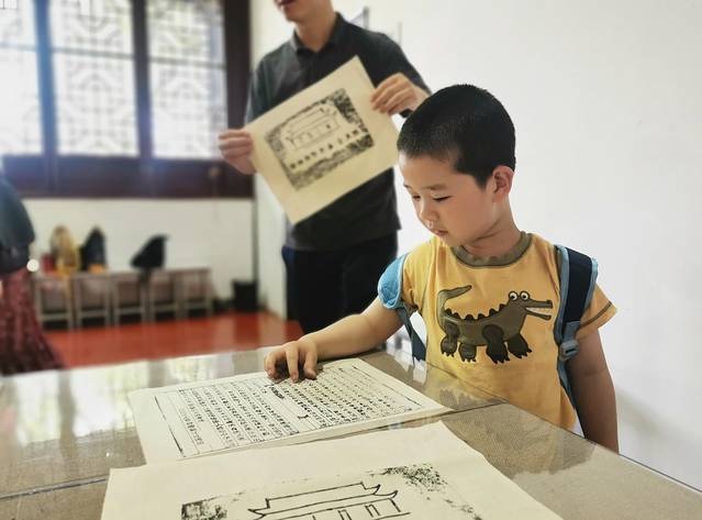 10分钟后,我们有秩序地排队,体验雕版印刷,一幅画与一篇字,小孩们不亦乐乎,选着自己中意的主题。