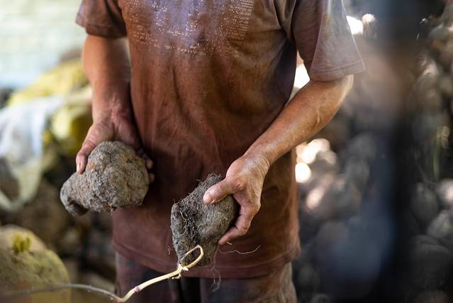 香云纱要用到坯绸和薯莨液,经过浸莨、晒莨、封莨、煮绸,再到过泥、清洗河泥、封莨和摊雾等一系列手工工序,经过反复的工艺,多种配料在丝绸料上产生的化学反应,白坯纱才生成品质优良的香云纱。