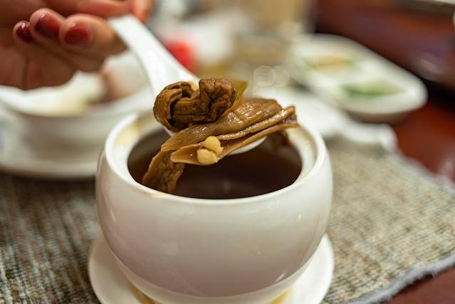 下面的几道菜也很推荐,比如暖心暖胃的冬瓜薏米炖山珍汤,冰镇长爪虾菇,汁多皮脆的黑松露乳鸽,香甜爽口的牛乳牛草肚粥水锅底,配十年份鲩鱼肉,香口的咸煎饼拼旺阁煎粽,简直人间美味。