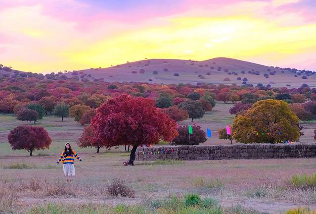 塞下秋来风景异,一年好景都在这里了。此时是漫山遍野层林尽染,姹紫嫣红。夕阳西下时分显得格外好看,红霞满天,火红的枫叶与天共色,人如在画境中行走。