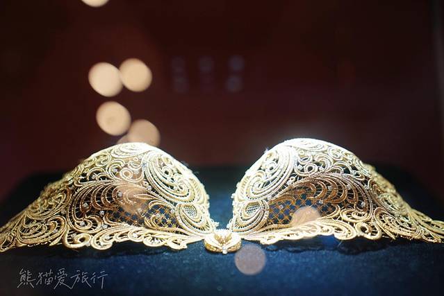 这里还有一件镇馆之宝——黄金璀璨文胸,按中国传统凤尾元素蕾丝编织手法,将24K黄金制作为直径仅0.28毫米、长达500多米如发丝般柔细的金丝,手工织造成富有30多种变化的蕾丝纹样,并点缀160颗南非美钻,中间美钻单颗达2.13克拉,中国珠宝首席设计大师耗时半年时间纯手工制作完成。
