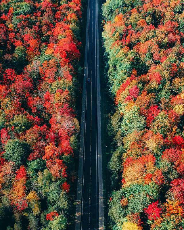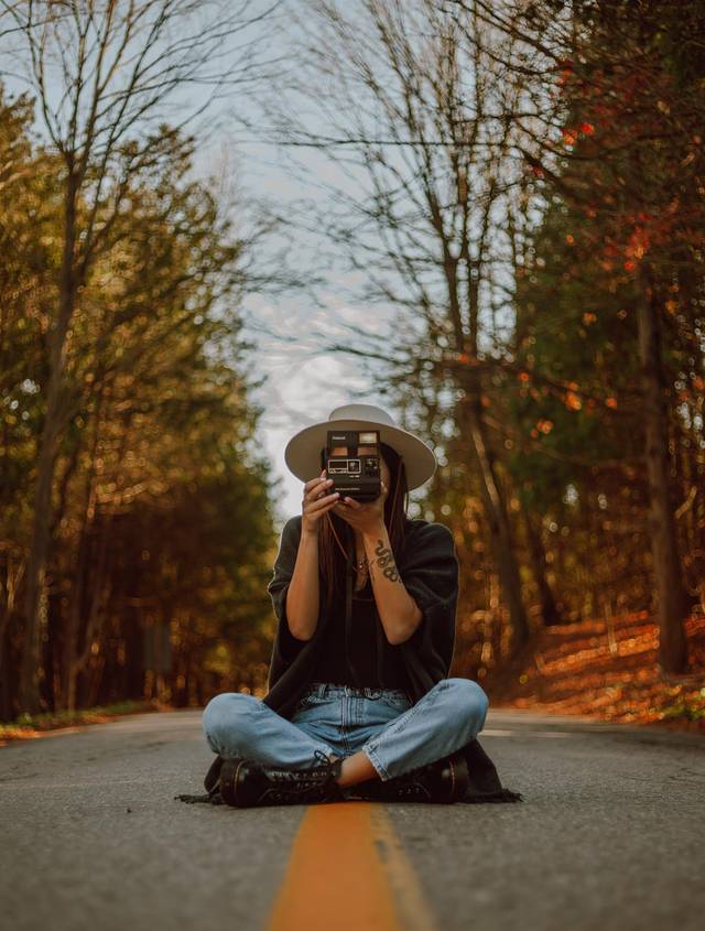 1. 高中低矮机位变换:拍秋天的道路时,要注意调整使用不同的机位,比如蹲下的同时把相机放得低一点,适当仰拍一些,这样的角度可以放大树木的画面占比,使照片更有看头。