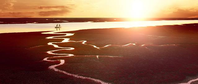 每年秋季,辽河口的海岸就像镶上了一条红锦带,如霞似火,绚烂无边。经过海的涤荡与滩的积沉,碱的渗透与盐的浸润,红海滩才得以红似朝霞,成为“中国最美六大湿地之一”。