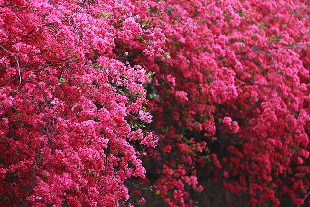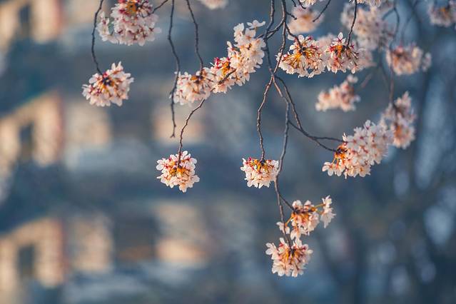 1.虚化背景:近拍花朵枝头,选择与花朵颜色对比鲜明的背景,再对焦至花朵,虚化整个背景,使得画面简洁而不单调。