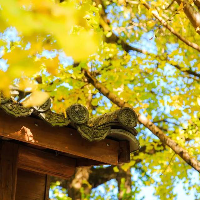 若想将银杏秋色与古朴村落的美镌刻,日出和傍晚的光线最合适不过。阳光穿过轻盈的叶片,落在松软的土地上,把地面铺成了一片温暖的浅黄。黄绿相间的秋林村落,正是众多旅人心中理想的乌托邦。