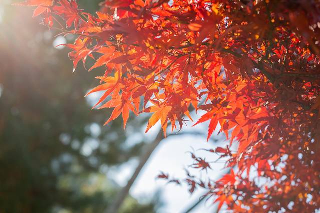 2.逆光拍摄:逆光拍摄可以为照片带来非常迷人的炫光效果,同时,侧光能表现出树叶的通透感、纹理以及阴影等,增加画面整体的表现力和美感,选择光线饱和又柔和的日出或傍晚,用此时的光线拍摄,能够凸显画面的层次感。