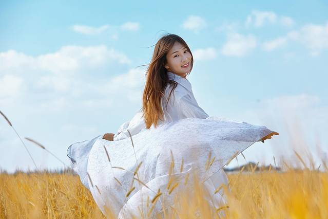2.放大服饰优势:对于芦苇或者稻田这种细细长长又绒绒的植物,比较容易构造出轻盈、缥缈的意境,在拍照时搭配上一些轻柔的外衣或者纱巾,旋转微笑看镜头,手臂尽量打开,整个画面的线条轮廓会十分灵动。(记得衣服不要和景物撞色了哦~)