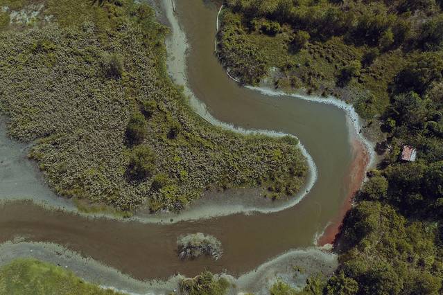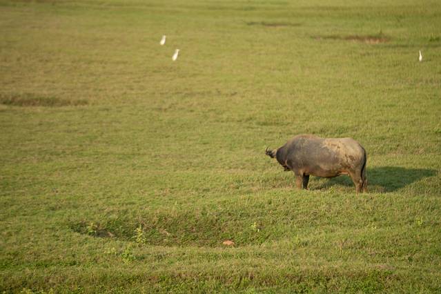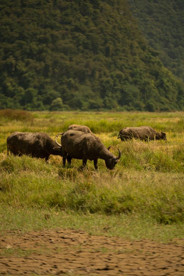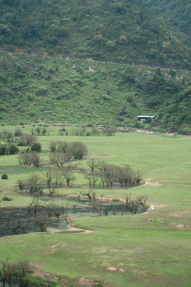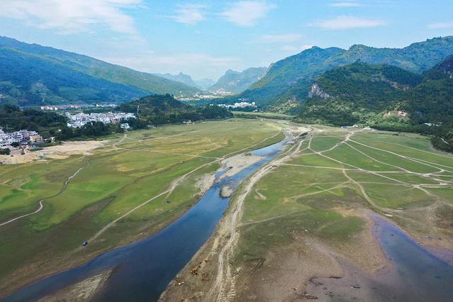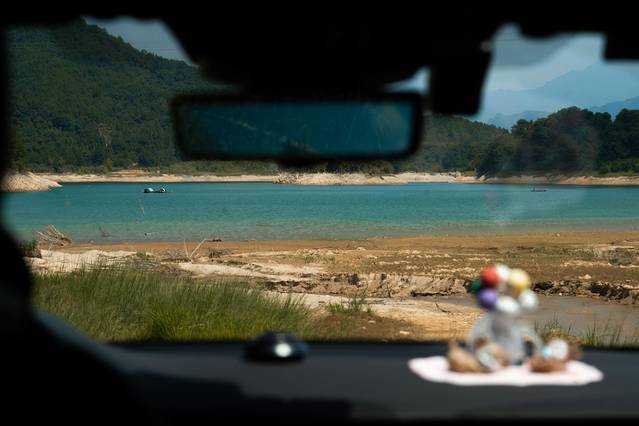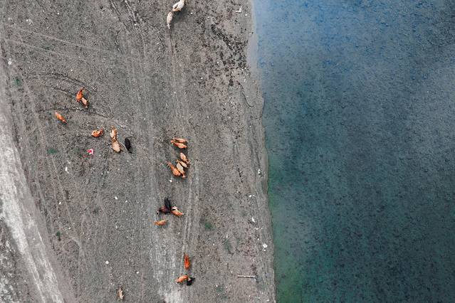 我们去的地方位于水库的最北部,叫“鲤鱼坝”,这里的位置靠近水库边缘,水位偏低,因为季节关系,原本有水的地方都已经露出了土,而且已经风干很久长出了野草,有很多当地村民会在这里放自家的马牛羊,远远望去就好像一片大草原。