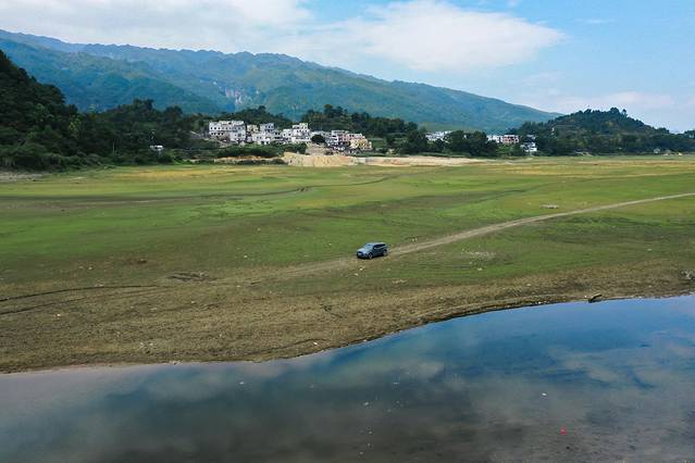 Tips:我们开车下去的地方是因为季节原因,水库水位降低以后露出的浅滩上长出的野草坪,不是养护的绿植,所以在上面行驶并开不会破坏绿化环境。但还是要量力而行,如果刚下过雨,不建议把车开下去,很容易陷车。