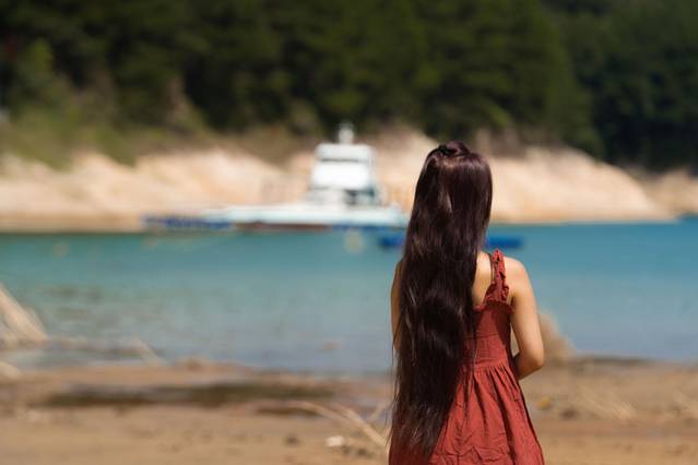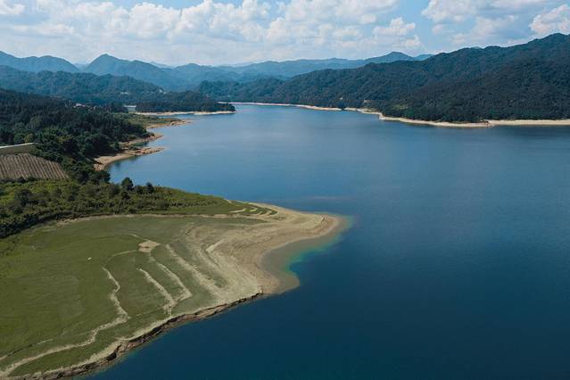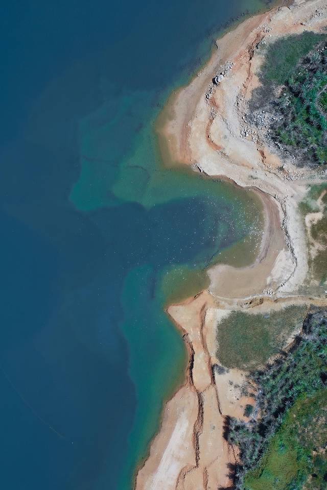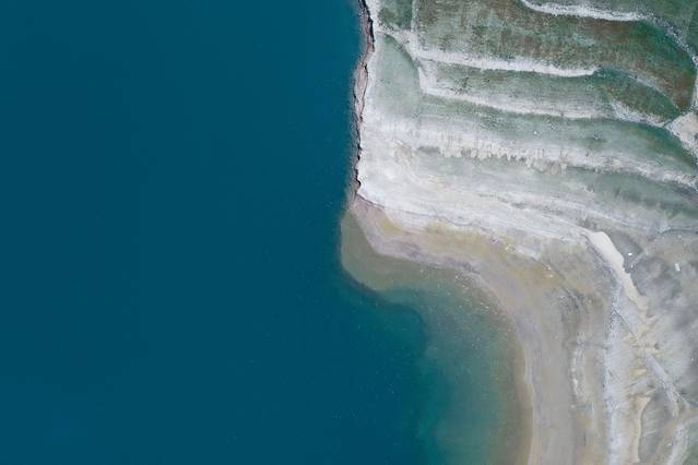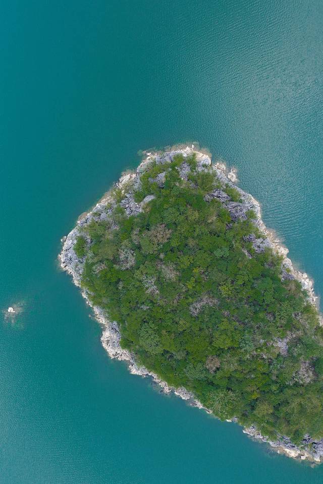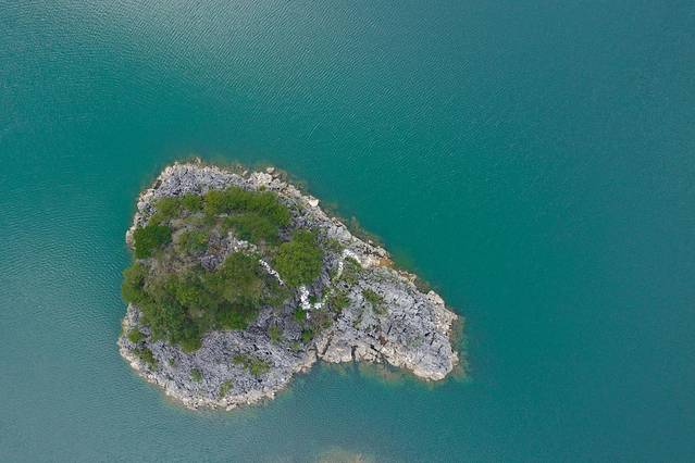 这里的水位很深,最深的地方有100多米,所以湖水呈现出海岛般的深蓝色。尤其是航拍视角下,旁边的泥土在太阳的反光下变得很浅,更呈现出沙滩的错觉。