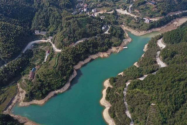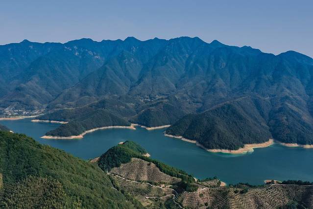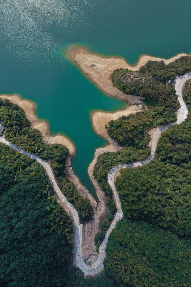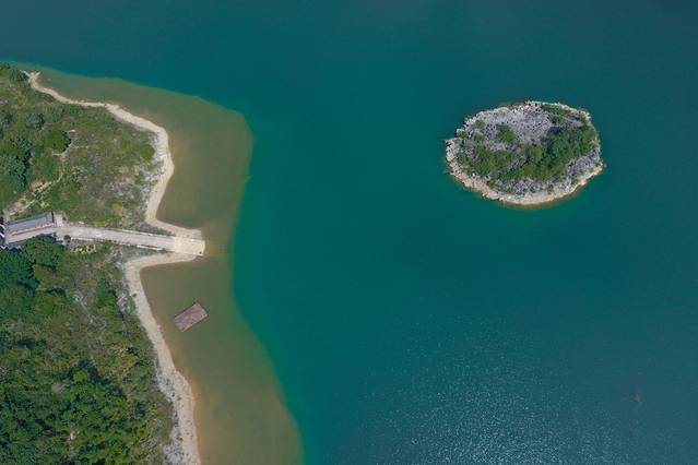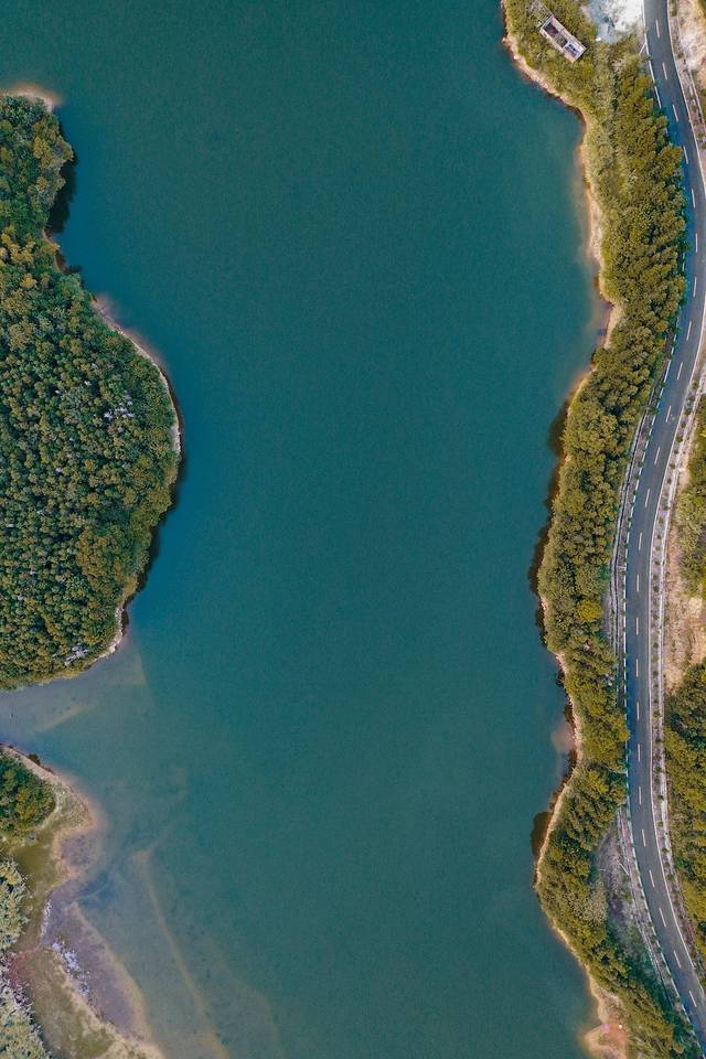 在无人机的视角下才能真正感受到这个水库的壮阔,上帝视角下湖面的颜色也显得更加的透亮。