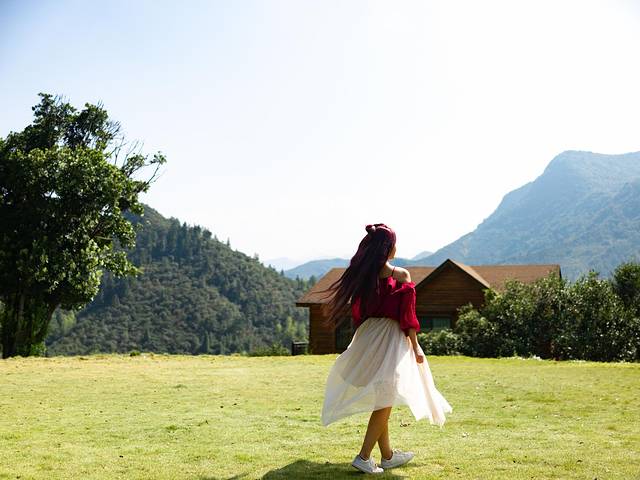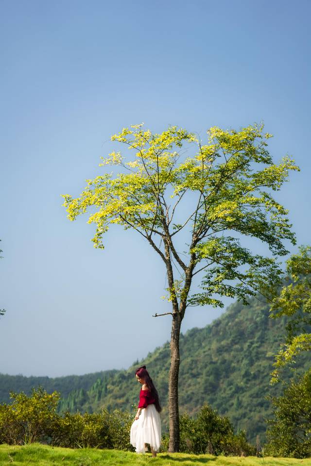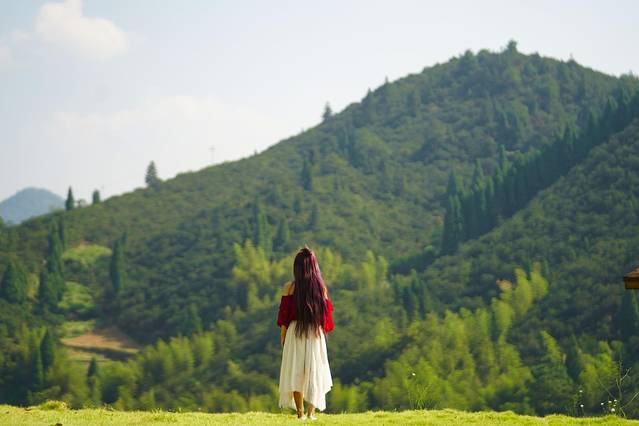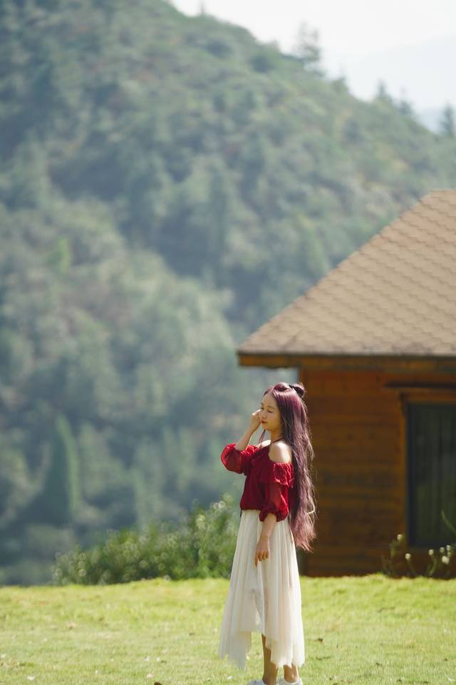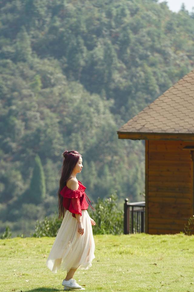 在海拔600多米的山顶,建了一家木屋民宿,小木屋前有大片的草坪,以大山做背景,超级出片,而且这个民宿是开放式的,即使不入住也可以到山顶拍照。