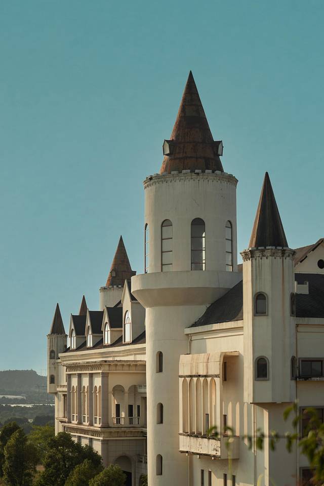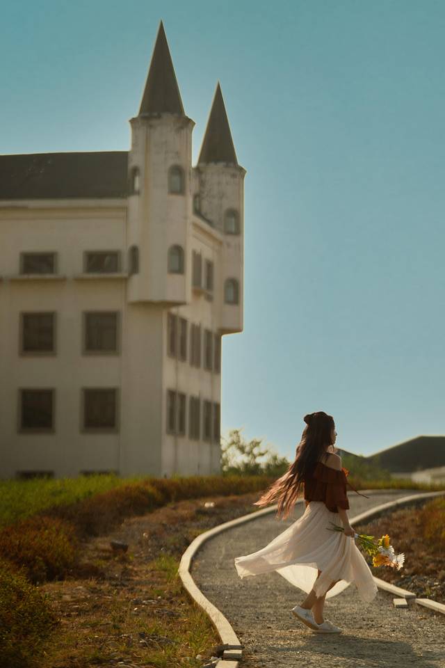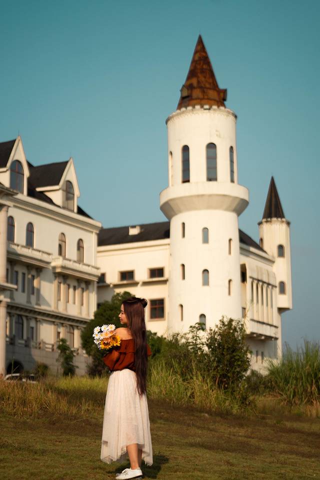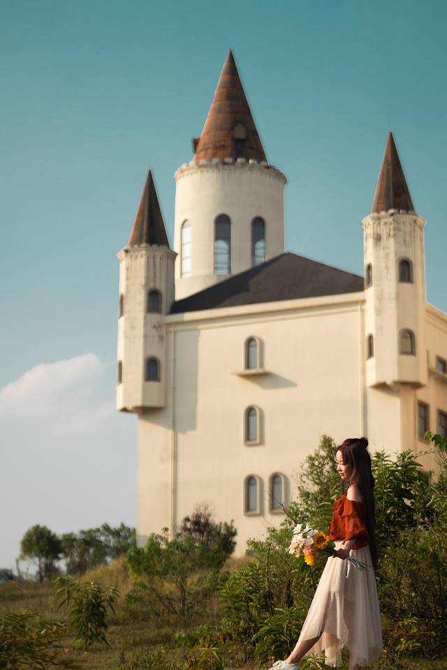 原本附近这一片都是收费的亲子游乐园,但是被荒废了,这栋欧式建筑也没有持续维护,一楼的玻璃窗都碎了好几块,却也阴错阳差成为了小众的拍摄地,有很多新人会在这里拍摄婚纱照。