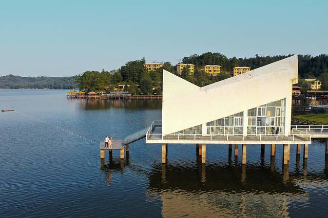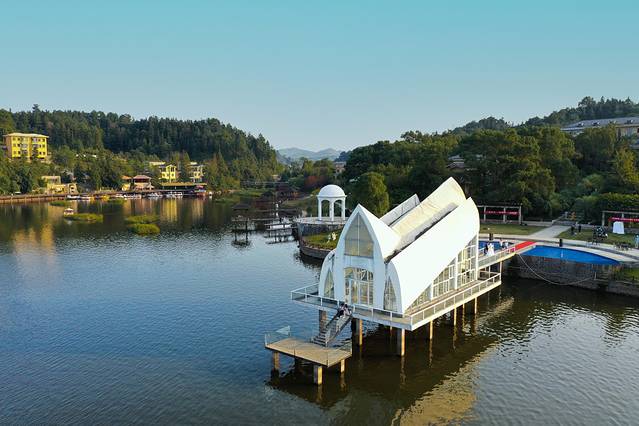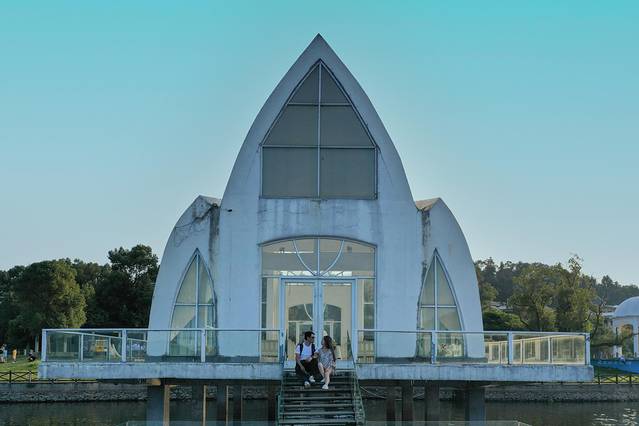 在仙女湖的南部有一座影视城,有各类适合摆拍打卡的道具,起初是米兰婚纱摄影在这里专门为新人拍婚纱照建的一座户外摄影场地,现在属于凤凰湾度假村的一部分,成了一个对外开放的公园,里面的风车、教堂、泳池、牧马人等道具都保留了下来,只是几乎没有维护,细看很破败。