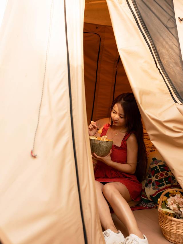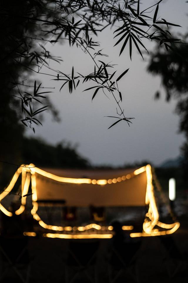 夜幕降临,每个帐篷亮起灯后,才是营地最美的时刻,我们还自带了一个落日灯打在帐篷上,更有氛围感啦!连营地工作人员从我们帐篷走过都说我们这最像网红打卡地哈哈~