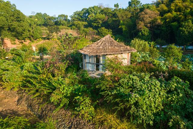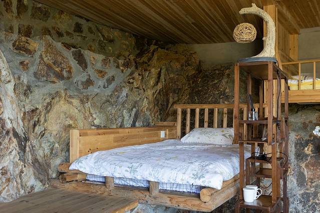与树屋一样,窑洞房同样富有特色。从外形看,像是一座由石头堆砌而成的石屋。而内部,别有洞天。除了有电视机、空调、卫生间,还有麻将桌、藤椅、书柜等。最让人惊喜的是,许多墙面居然是山体的天然岩石。
