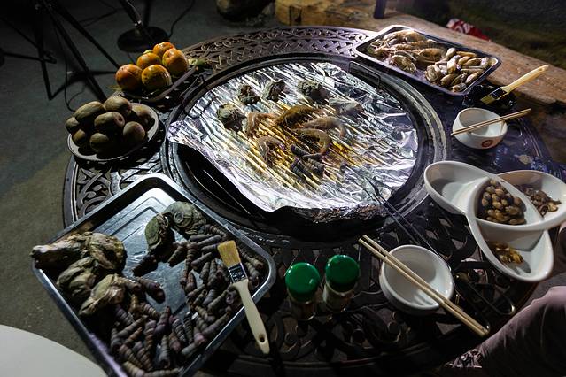 星空下的夜晚,还可以在帐篷旁来一顿海鲜烧烤。你可以自己带食材,也可以提前叫景区工作人员准备好食材。青蟹、牡蛎、蛏子、鲜虾等三门小海鲜,搭配花生米、水果、自酿果酒。大家围着炭火烤炉,一边品尝自己亲手烤出来的食物,一边谈笑风生,感受生活的无限美好。