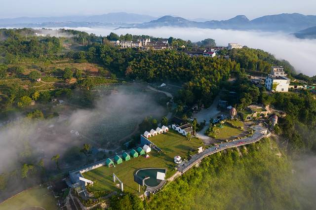 沿着蜿蜒而上的小道走进景区,第一眼便是唯美的山顶草坪。这里刚获评2021浙江省十大最具潜力露营地。你可以自己带帐篷,也可以住营地里的帐篷。夜晚,你可以仰望星空;清晨,你可以看云海日出。