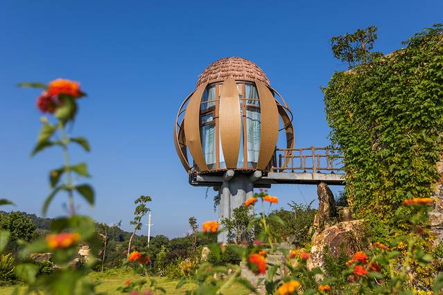 拥有360°视野的“子弹头”树屋,“生长”在悬崖峭壁上。低头可以俯瞰山谷,抬头可以看星空。房间虽然不大,但是电视机、空调、沙发、卫生间一应俱全。分为上下两层,由螺旋楼梯连接。一层是卫生间和客厅,二层是星空顶和榻榻米。