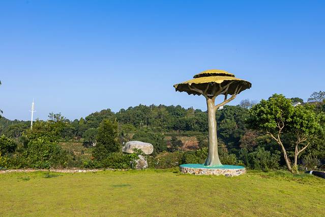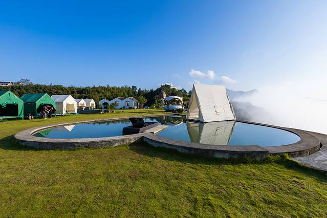 整个营地生意盎然,充满了鲜花、绿草、“蘑菇树”、石屋、树屋,仿佛是“爱丽丝梦游仙境”。营地里还有爱心池、水上沙发、水上帐篷、秋千、天梯等网红打卡点。爱心状的水池,据说原先是个消防水池。水池上面的水上沙发和水上帐篷,是出片的好地方。