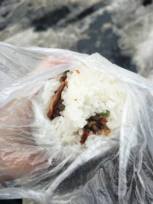 糯米饭包烤肉还挺好吃的呢